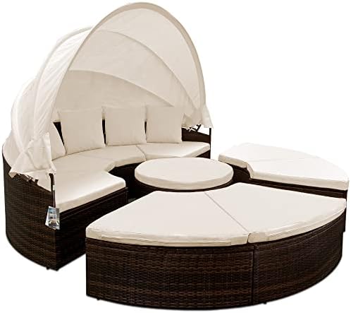 ProductbeschrijvingExclusief polyrattan zonne-eiland 230 cm in zwart of bruin – hoogwaardige tuinmeubelen voor jouw tuin!Afneembare stoelhoezen & 4 comfortabele kussens:De hoezen van de 7 cm dikke zitkussens zijn waterafstotend. De afneembare hoezen hebben ook een blinde ritssluiting. De 4 grote kussens hebben de afmetingen: 43 x 43 x 15 cm.Uitklapbare zonnedak:De opklapbare zonwering met gasdrukcilinder zorgt voor aangename schaduw in de zon en beschermt tegen wind. Het deelbare ligvlak kan in een handomdraai worden omgebouwd tot tafel en comfortabele stoelen. De afzonderlijke delen van het eiland kunnen met verbindingshaken aan elkaar worden verbonden.Onderbouw / gaas:Het polyrattan is gevlochten op een extra versterkt metalen frame. Dankzij de verstelbare schroefpootjes kan het eiland ook op oneffen ondergronden stevig staan. Polyrotan is een zeer stabiele, gelijkmatig gewikkelde kunststofvezel die speciaal is ontwikkeld voor tuinmeubelen. Het polyrotan is vuilafstotend en eenvoudig schoon te maken.Multifunctioneel inzetbaar:2 in 1: Te gebruiken als comfortabel ligvlak of zitgroep.Productvoordelen:Inclusief zonnedak met gasdrukcilinderInclusief zonnedak met gasdrukcilinderInclusief 4 kussens – 43 x 43 x 15 cmInclusief 4 kussens – 43 x 43 x 15 cmExtra versterkt metalen frameExtra versterkt metalen frameOnderhoudsvriendelijkOnderhoudsvriendelijkVariabel combineerbaarVariabel combineerbaar7 cm dikke kussens, waterafstotend7 cm dikke kussens, waterafstotendHoezen zijn afneembaar en onderhoudsvriendelijk dankzij de vloeistofafstotende coatingHoezen zijn afneembaar en onderhoudsvriendelijk dankzij de vloeistofafstotende coatingAfmetingen compleet:(lxbxh): 230 x 230 x 175 cm(lxbxh): 230 x 230 x 175 cmHoogte met geopende zonnedak: 175 cmHoogte met geopende zonnedak: 175 cmHoogte gesloten zonnedak: 65 cmHoogte gesloten zonnedak: 65 cmZithoogte zonder bekleding: 34 cm (inclusief zitkussen: 41 cm)Zithoogte zonder bekleding: 34 cm (inclusief zitkussen: 41 cm)Tafel: (Øxh): 80 x 34 cmTafel: (Øxh): 80 x 34 cmVeiligheidswaarschuwingLet op: lees de montage-instructies zorgvuldig door voordat je begint met de montage. Let op de onderhoudsinstructies om de duurzaamheid en veiligheid van het product te garanderen.