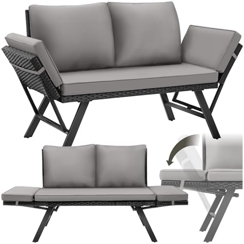 tectake® 2-in-1 Wicker Loungebank met Verstelbare Armleuningen, Tuinset, Loungeset, UV- en Weerbestendig Ligbed, Balkonbank Incl. Kussens, Tuinbank, Outdoor Loungesofa, Tuinmeubelen, Grijs