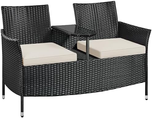 Yaheetech 2-zits polyrotan tuinbank met tafel en kussens, stabiele rotan zitbank, 350 kg belastbaarheid, 131 x 65,5 x 85 cm, weerbestendig, balkonbank, tuinmeubelen voor tuin, balkon, terras,